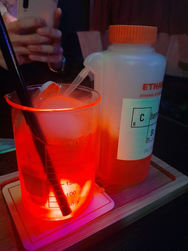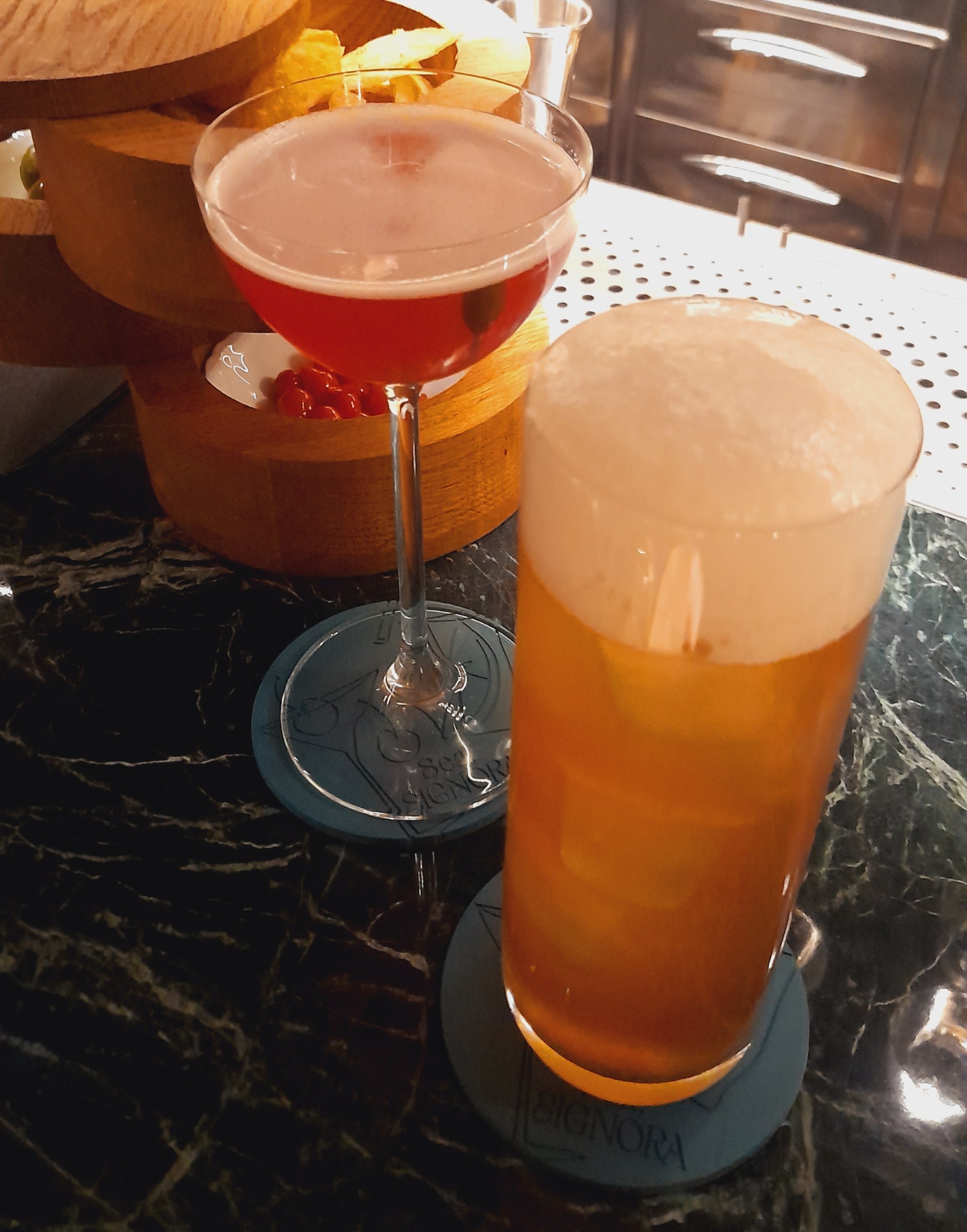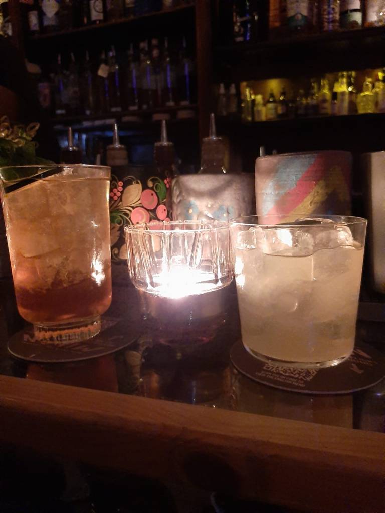 Ci accomodiamo al bancone e diamo un primo sguardo alla drink list stagionale: oltre ai classici, la signature list ha un tema il nome di un Paese (dall’Italia al mondo) associati ad un ballo, invitando ad immergersi in un viaggio caratterizzato da specifiche note evocative e sensoriali alla degustazione. Scegliamo di provare un classico per me (Martini dry) e una loro miscelazione, il ‘Perù Cumbia‘ (a base di Pisco 1615 Acholado, cioccolato bianco, limone nero e chocolate bitter), un mix di sentori dolci, agrumati e leggermente affumicati.