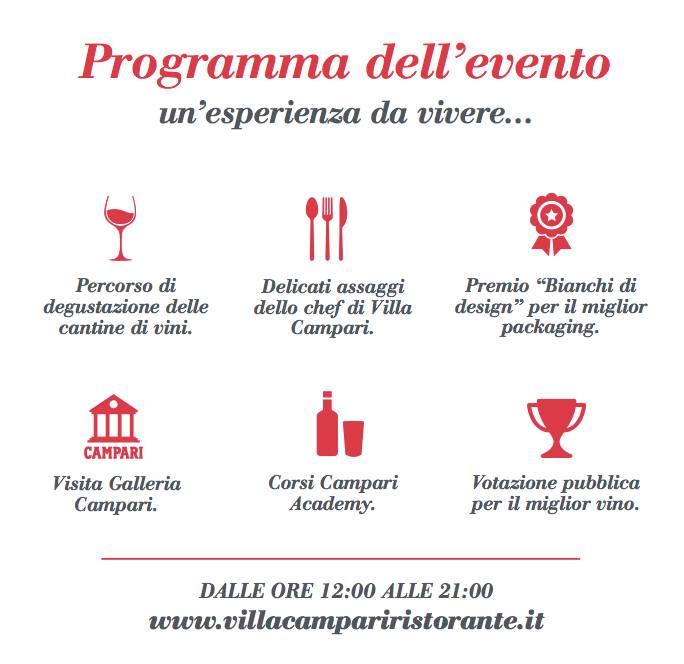Dalle 12.00 alle 21.00 gli ospiti avranno l’opportunità di conoscere e di degustare, all’interno della raffinata e storica Villa Campari, una ventina di etichette provenienti dalle migliori zone vocate alla produzione di vino.