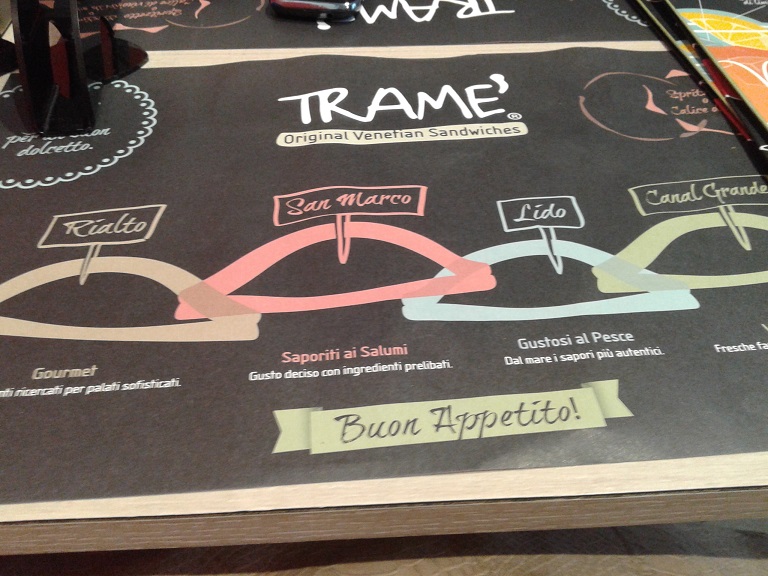 Troverete al Tramè l’ottimo connubio tra 4 tipologie di Spritz (con Select, Campari, Aperol e Cynar) e una lunga scelta di tramezzini partendo dal quelli dal sapore vegetariano (Canal Grande), passando alla farcitura di pesce con gusti più classici (Lido) , al più ricco e ricercato abbinamento dei tramezzini gourmet ( Rialto), terminando con l’intenso gusto dei salumi ( San Marco).