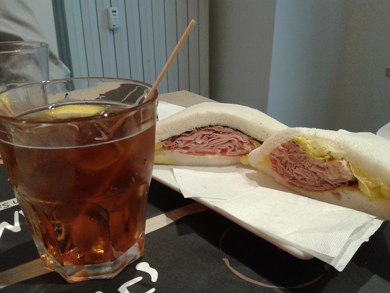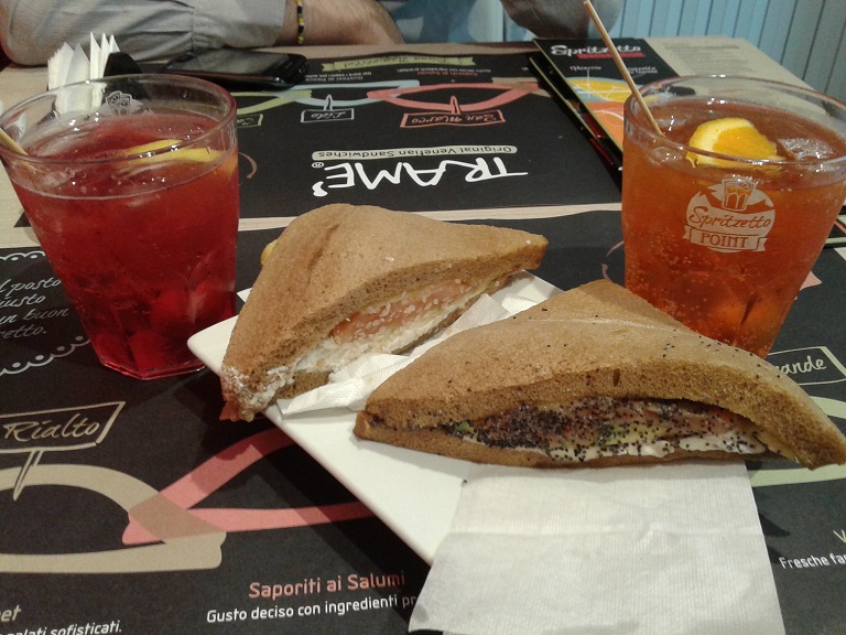 Certamente entrando nel locale, dove il bancone espositivo di queste saporite creazioni la fa da padrone, la scelta su quale tramezzino assaggiare ed abbinare al il proprio bicchiere di “Spritzetto” non sarà sicuramente facile; nel mio caso la scelta è ricaduta come primo assaggio su due tramezzini a base di salmone, l’uno con avocado semi di papavero e cream cheese e l’altro con mela verde sesamo e cream cheese. L’assaggio è poi continuato con due tramezzini dalle note più intense grazie all’abbinamento di mortadella, pomodoro fresco e crema al tartufo nero del primo e porchetta cotta a legna, pomodoro fresco e senape del secondo.