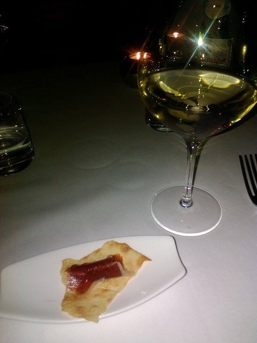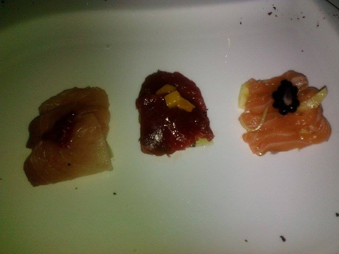Le crudità di mare sono uno dei punti forti della cucina dell’Alexander e la mia cena non poteva quindi cominciare diversamente, un tris di sashimi: tonno rosso con mango e kiwi, salmone con pezzetto di mora e ricciola con una punta di composta di lamponi. Era la prima volta che assaporavo l’unione tra il pesce crudo e la frutta, che ho preferito lasciare in purezza senza ulteriori condimenti, e vi garantisco che ne sono rimasto estasiato.