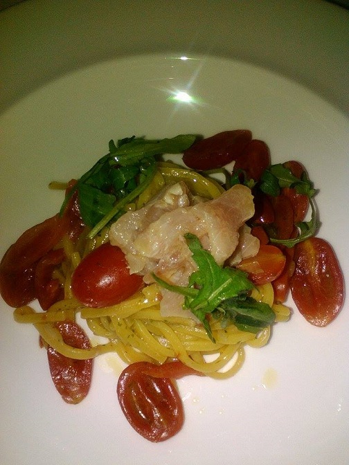 La selezione è proseguita con capasanta scottata condita con lemongrass, su una vellutata di zucchine con pezzetti di prosciutto di angus croccante, una perfetta combinazione di sapori terra/mare. I due primi a seguire sono stati un risotto con porcini scottati e arrostiti e polpa di gambero (squisito) e una chitarra con pomodorini freschi, ceviche di ricciola e varie spezie per una nota piccantina con il fine di ricreare un riuscitissimo matrimonio di sapori italo-peruviani. Per finire un secondo all’altezza del resto delle pietanze: della ricciola con nocciole tostate e patata schiacciata, una dadolata di avocado a ricreare la guacamole con una consistenza diversa dal solito e delle erbette scottate con mozzarella di bufala.