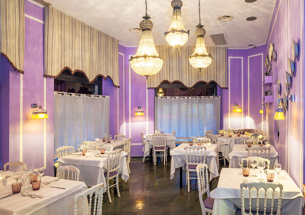 Tre sale dalle pareti di color lilla, lampadari di cristallo e arredamento molto ricercato; è questo l’ambiente che ci aspetta una volta entrati al ‘Mosto Selvatico’. L’atmosfera tipicamente francese del locale ci abbraccia facendoci sentire ben accolti e un po’ coccolati in questo clima caratterizzato da dettagli lussuosi.