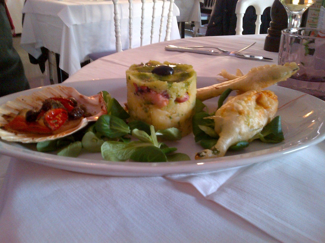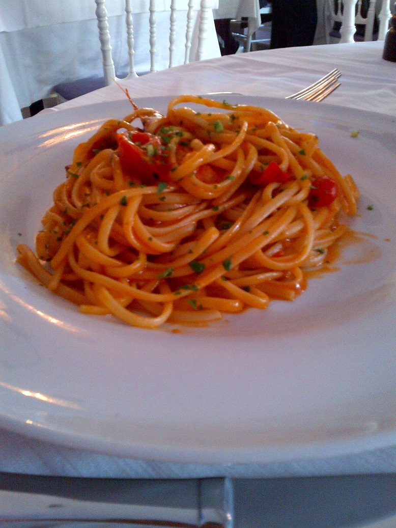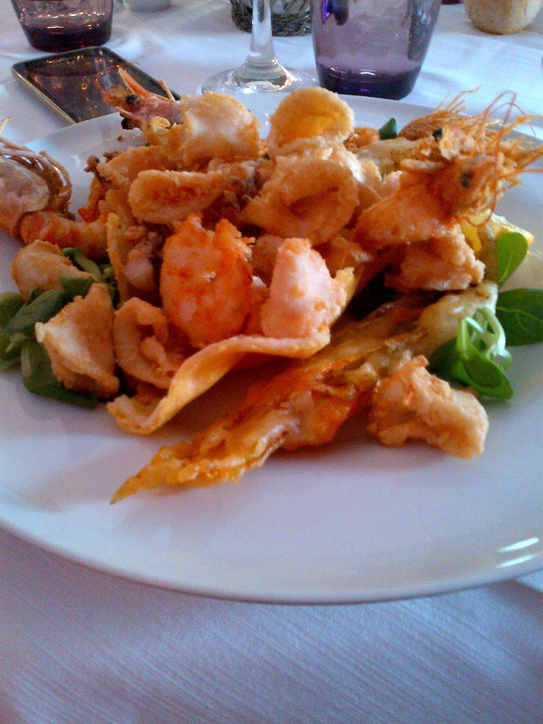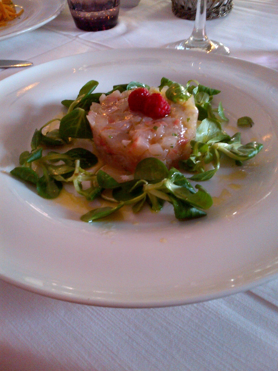 Il menù alla carta (suddiviso tra proposte di carne e ittiche) è molto variegato ma due piatti in particolare mi hanno impressionato: la tartare di ricciola con lamponi e ribes e la leggera frittura di calamaretti, gamberi e scampi in cialda di parmigiano sono vere e proprie delizie per il palato. Lo chef mostra le sue grandi qualità anche nei tagliolini con gamberi rossi di Mazara del Vallo, accompagnando il nostro pranzo con dell’ottimo Sauvignon del Friuli.