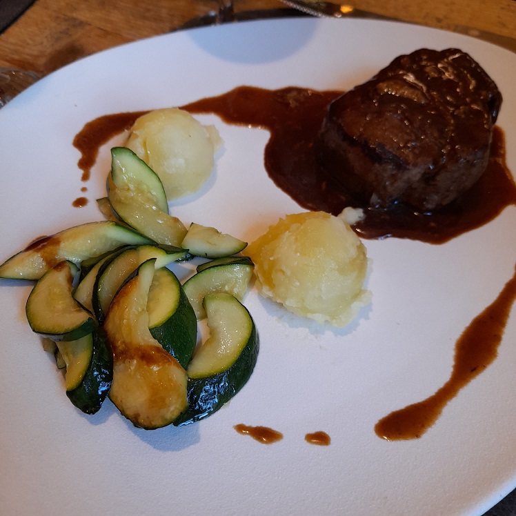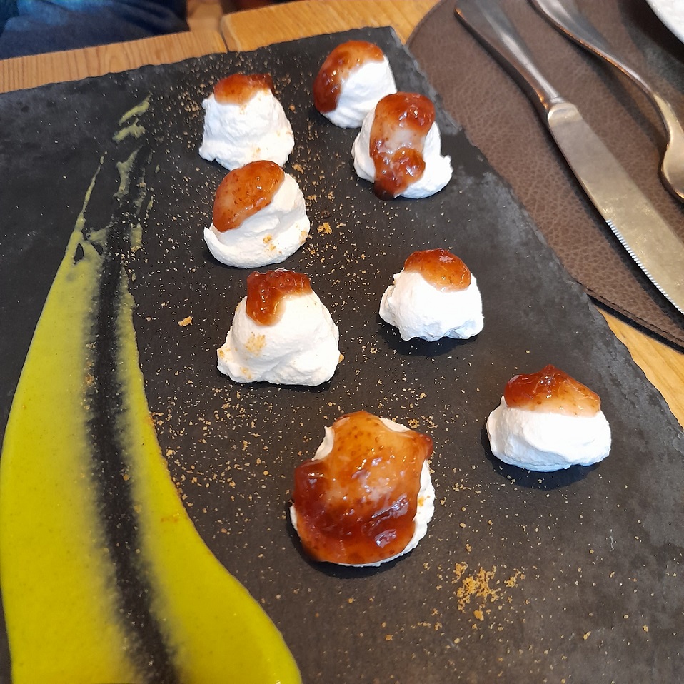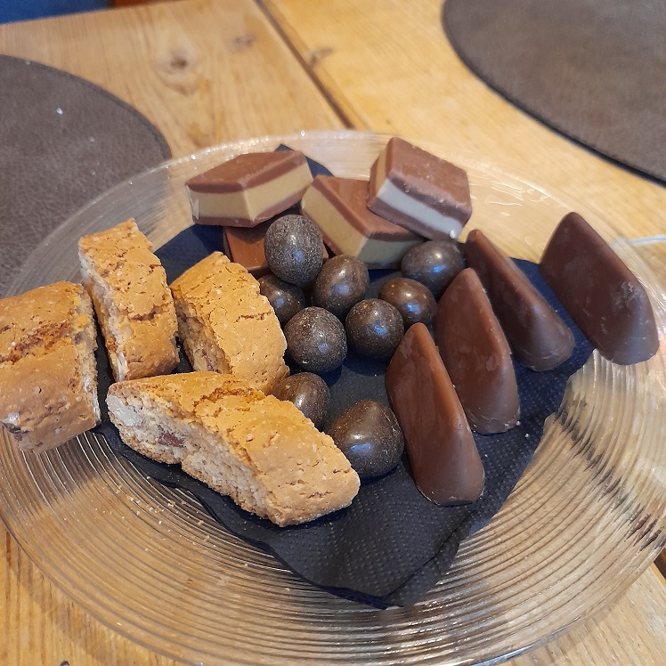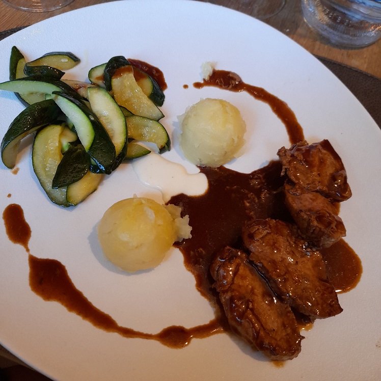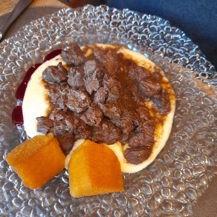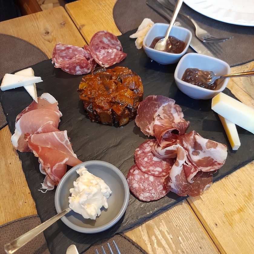 Il pranzo inizia con un piccolo assaggio offerto a tutti i clienti nell’attesa, per poi proseguire con le scelte dal menù. Noi abbiamo cominciato con un antipasto misto di affettati, formaggi e confetture dalle note agrodolci, da degustare con una saporita caponata di melanzane a completamento del piatto. Il pasto è proseguito con tre piatti dalla loro proposta di carne: filetto di maialino con patate, verdure e tocco di fonduta di formaggio, brasato di cervo al ginepro con composta di frutti rossi e crema di polenta morbida al taleggio e per finire una guancia di vitello con riduzione al vino rosso. Non abbiamo preso il dolce, ma assieme al caffè ci è stato servito un piattino con cioccolatini misti e biscottini. Una tappa che mi sento assolutamente di consigliarvi, ringrazio ancora lo staff per l’ottimo servizio e concludo con la fotogallery di questa golosa esperienza…