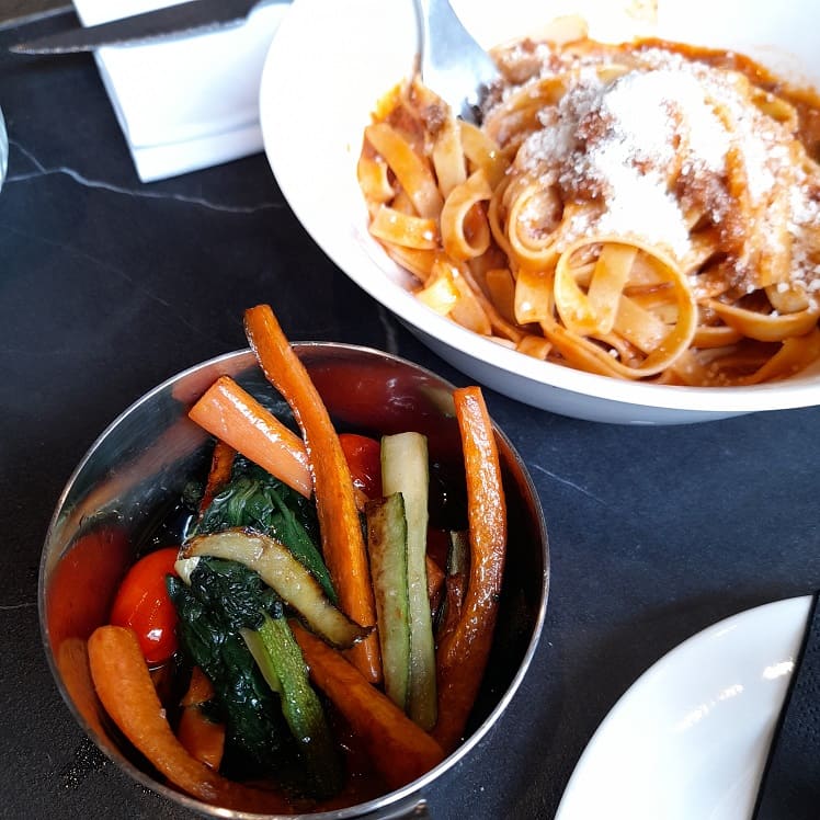 Il focus è la cucina italiana, puntando sulla tradizione e la qualità made in Italy delle materie prime con un menù che propone pasta fresca, pizza, primi e secondi piatti tradizionali. La nostra scelta è ricaduta sulle caserecce alla norma (pomodoro di Puglia, melanzane fritte, ricotta salata e basilico) e tagliatelle al ragù di chianina IGP con un contorno di verdure, quando la semplicità è di qualità non può deludere. Siamo rimasti molto soddisfatti di questa scelta: ecco una piccola fotogallery…