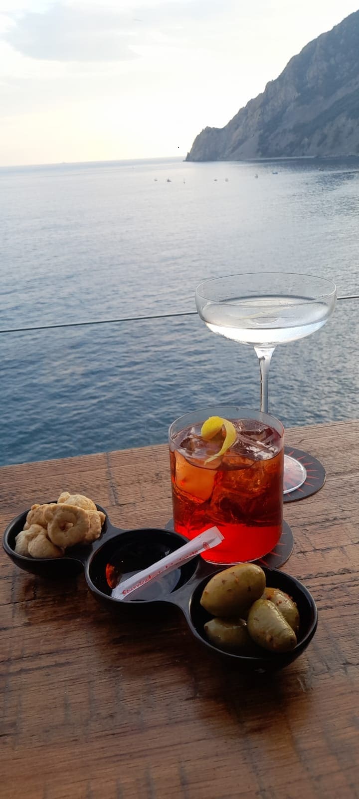 Atmosfera rilassata aiutata anche da un sottofondo musicale lounge che accompagnava perfettamente l’esperienza del nostro aperitivo qui (un Martini Dry e un Americano): la perfetta golden hour vista mare davanti ad una distesa blu a perdita d’occhio con il sole che tramontava.