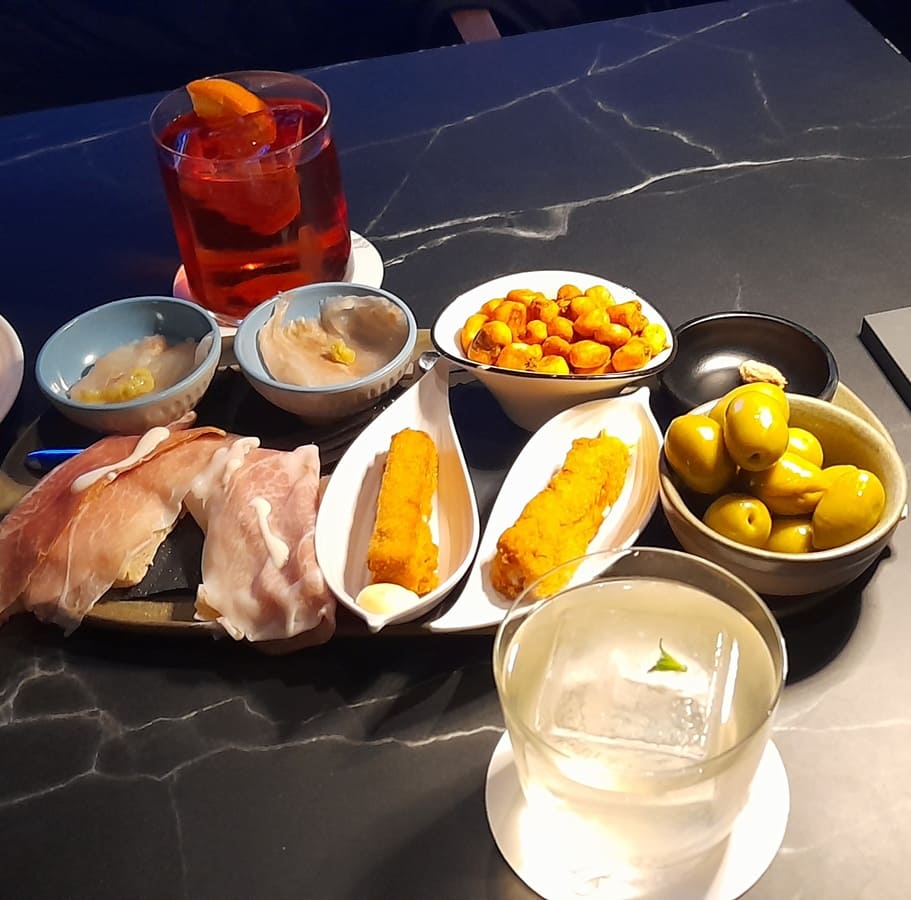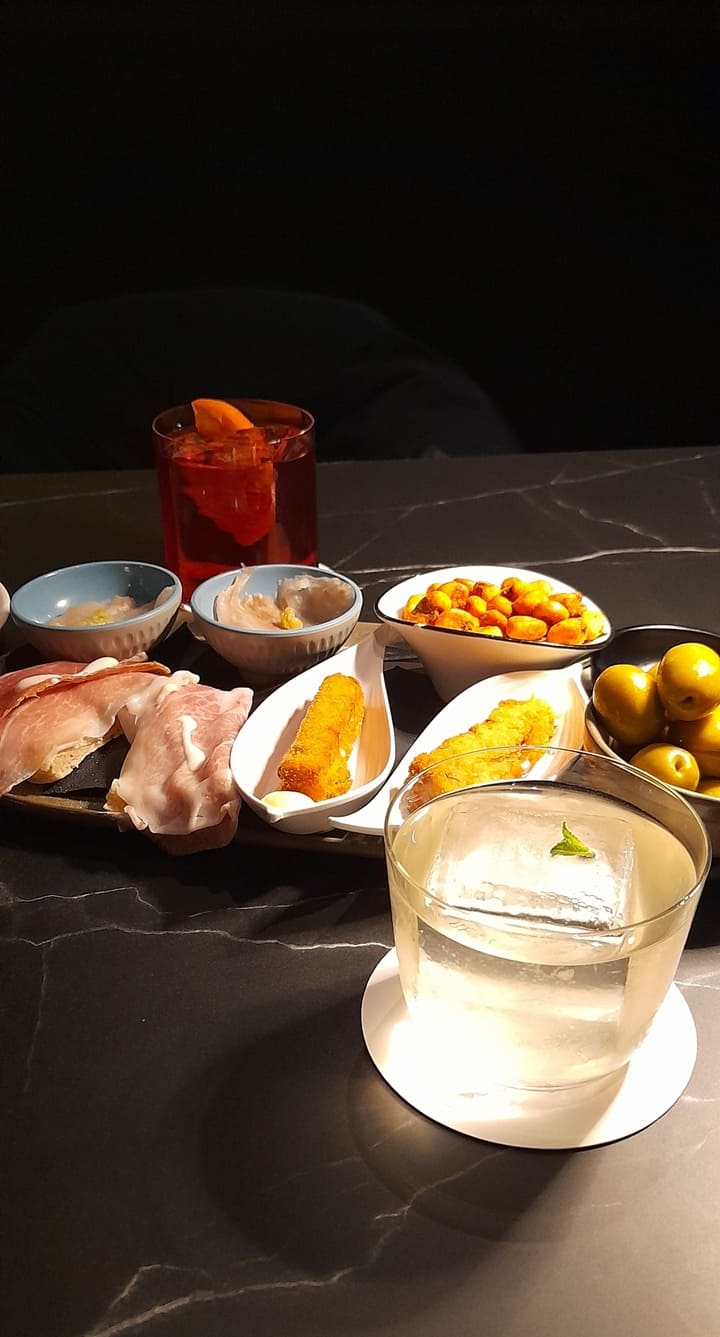 L’ambiente è la giusta combinazione tra mare e ‘cielo’ con colori tenui e rilassanti e un design dalle linee eleganti, moderne, mantenendo la semplicità senza troppi eccessi. L’atmosfera è piacevole, informale ed accogliente, ideale per accompagnare i vostri momenti come è stato per noi l’aperitivo: un Negroni classico (devo sottolineare tra i più buoni che abbia mai provato a Milano) e un drink scelto tra le loro proposte, ‘Apperù’ (Pisco, Vaniglia, Fava Tonca, Menta e Ananas), il giusto equilibrio tra note dolcine, aspre e fruttate. Il tutto è stato accompagnato da finger food e piccoli assaggi con abbinamenti curiosi, come carpaccio di branzino con alla base una purea di mela e topping al limone a dare la nota acida a completare il bilanciamento del gusto.