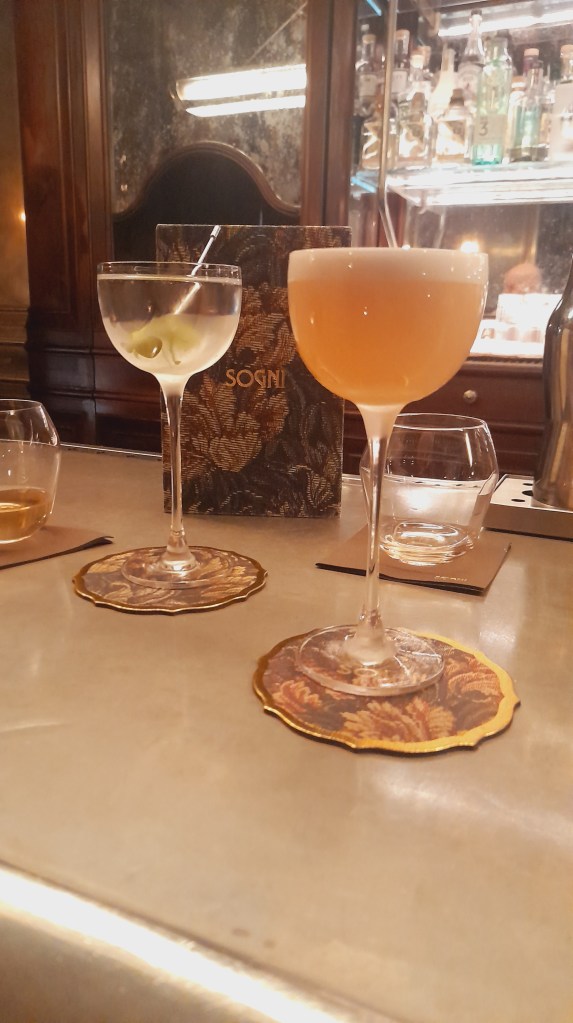 Abbiamo potuto vivere questo locale per un drink nel dopocena, in virtù del fatto che l’aspetto beverage è un focus del ‘Sogni’: la zona bar elegante e raffinata di ispirazione ‘900 è accogliente ed informale, inserendosi perfettamente nel mood luci soffuse di questo locale.