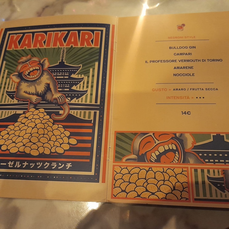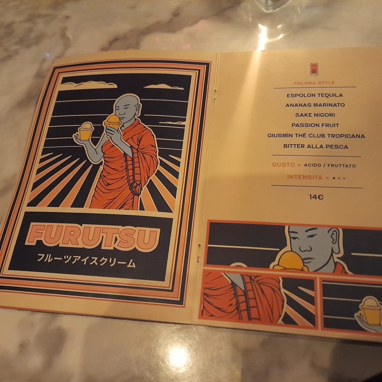Dalla drink list, ricercata anche nella grafica, abbiamo scelto di provare il ‘Karikari’ (Negroni style, Bulldog gin, il Professore Vermouth di Torino, nocciole, amarene e Campari), dalle note amare e di frutta secca e il ‘Furutsu’ (Espolon tequila, Ananas marinato, Sake Nigori, Passion Fruit, un tè verde aromatizzato dai sentori tropicali e bitter alla pesca), un mix di aspro/fruttato, ma più tendente all’acidulo. Abbiamo apprezzato particolarmente le proposte cocktail, uniche nel loro genere e che rispecchiano l’idea che sta alla base di questo locale.